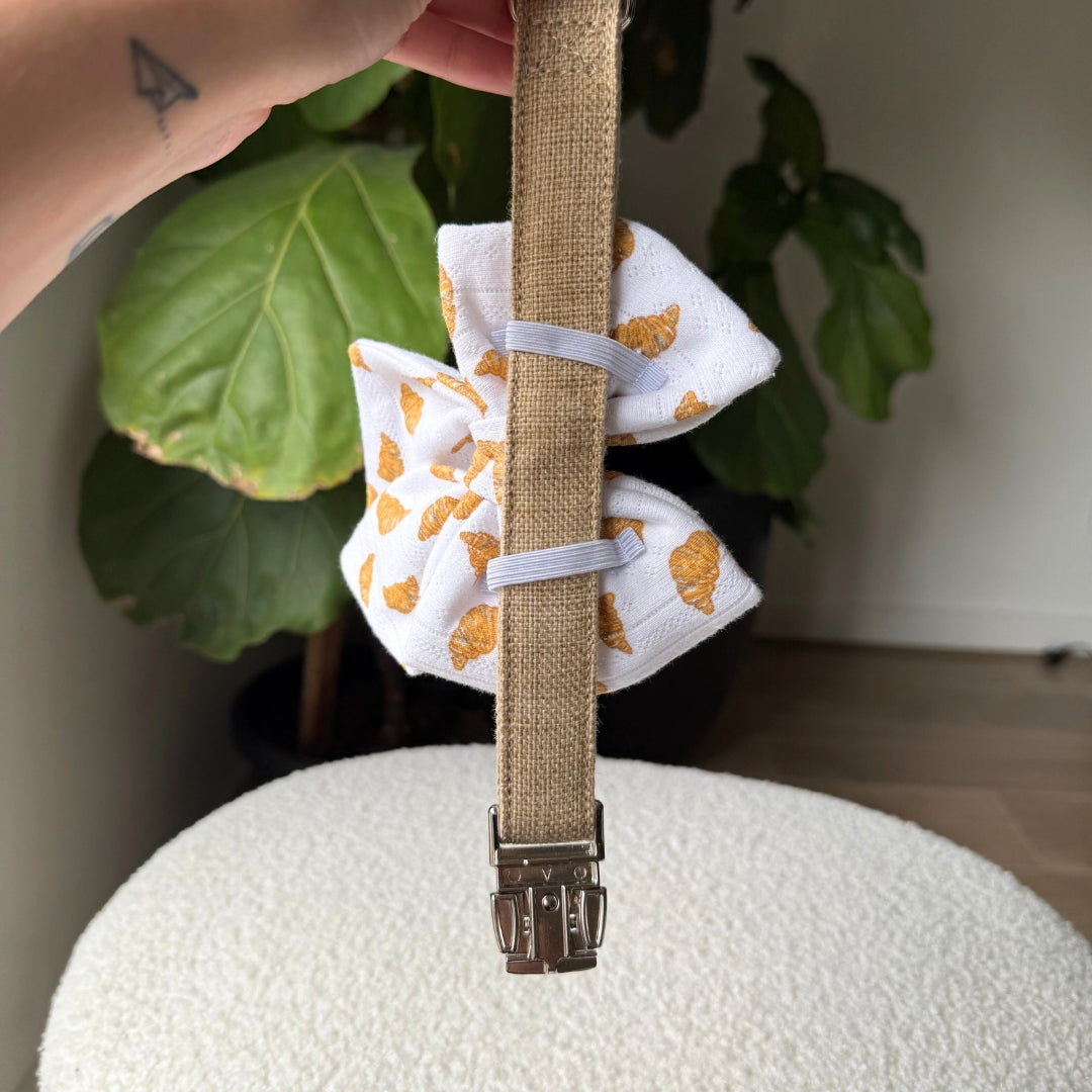Our gorgeous, thickly lined Bow Ties and Sailor Bow Ties are thoughtfully crafted to hold their shape and are perfect for pups who love to stand out. Each piece is designed to slip seamlessly over the collar and is finished with two built-in elastics, ensuring both comfort and security. Whether your dog has a plush, fluffy coat or loves to stay active, these bows are made to stay perfectly in place without pulling or slipping. Available in two versatile sizes for the perfect fit.